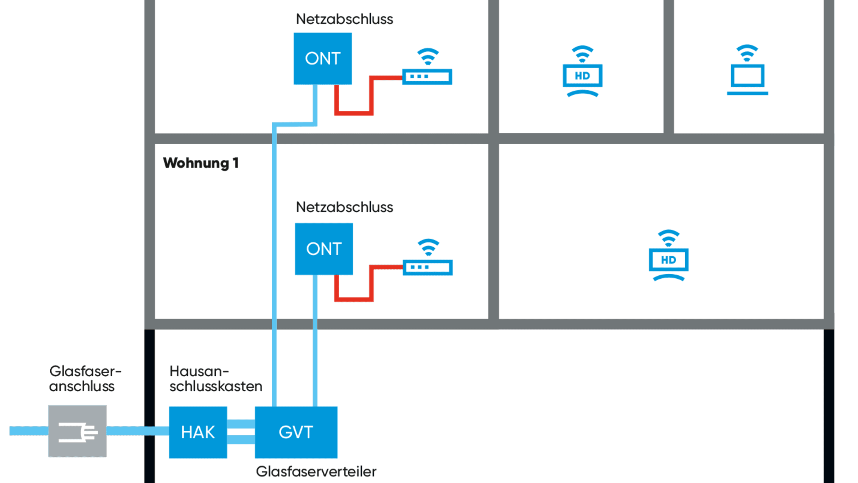 In einem Mehrfamilienhaus sollte aus Datenschutzgründen jede Wohnung mit einem ONT ausgestattet werden. Diese sind an den Glasfaserverteiler angeschlossen. Achten Sie auch hier auf einen 230V-Stromanschluss für Router und ONT. Wie bei einem Einfamilienhaus sollte jede Wohnung mit strukturierter Verkabelung und Medienverteiler ausgestattet sein. Leerrohre sollten bis zum Hausanschlussraum gelegt sein.