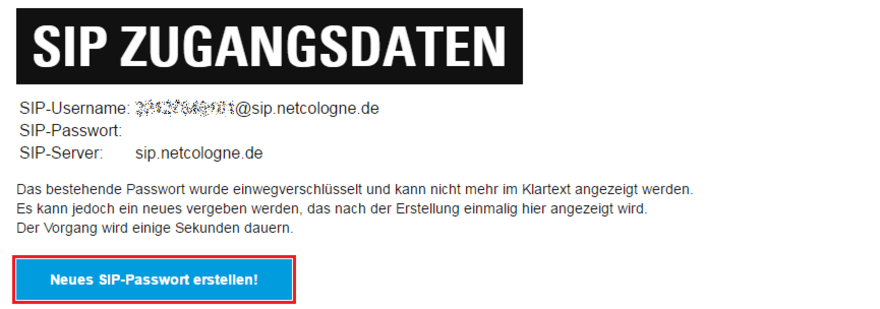 In dem neu geladenen Fenster kann jetzt ein neues SIP-Passwort erstellt werden. Diese Daten muss der Kunde in seine FritzBox eingeben.