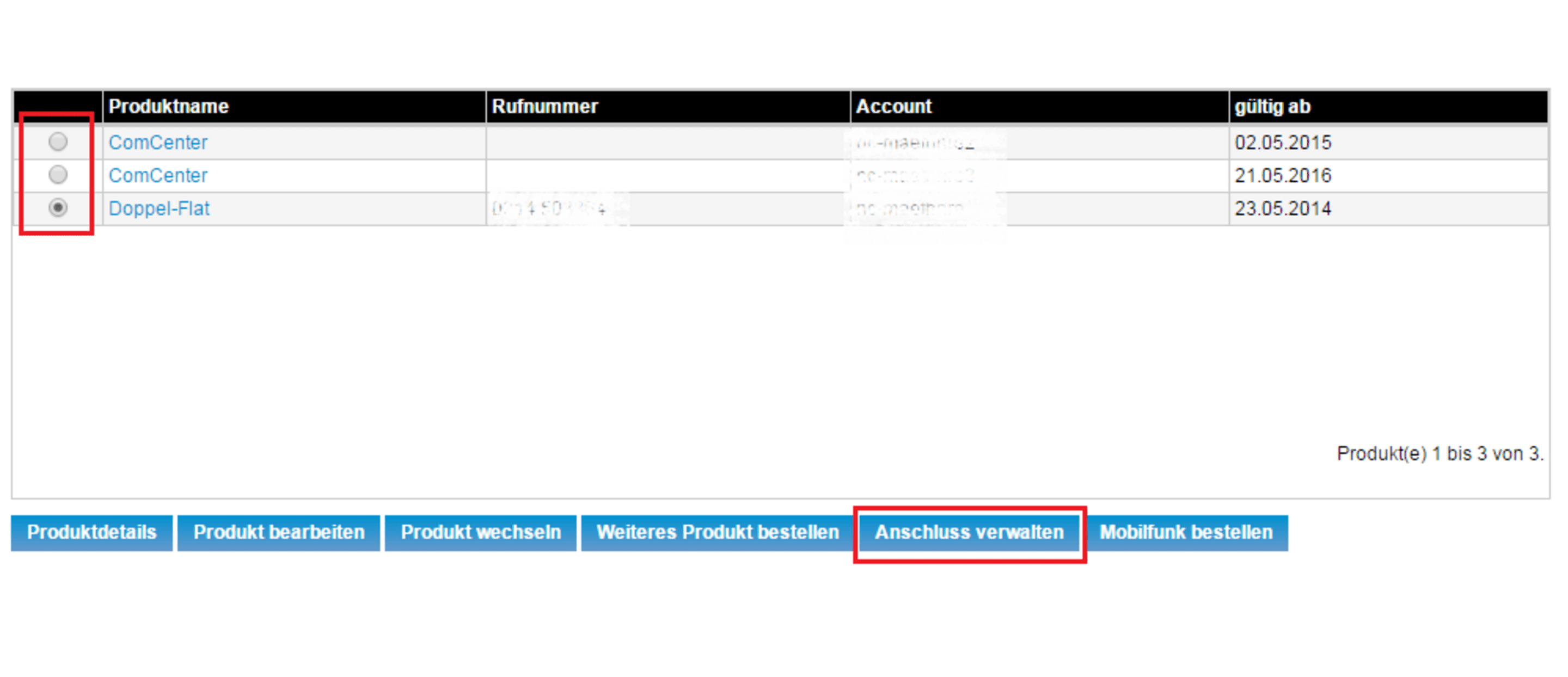 Auswahl der zu konfigurierenden Rufnummer.